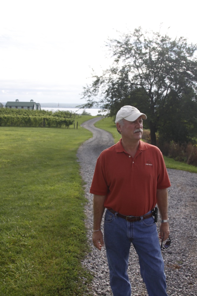 | Here, Scott is explaining how turkeys cling to the trellis and flap their wings so that the grapes fall. Before you know it two or three rows are stripped. |